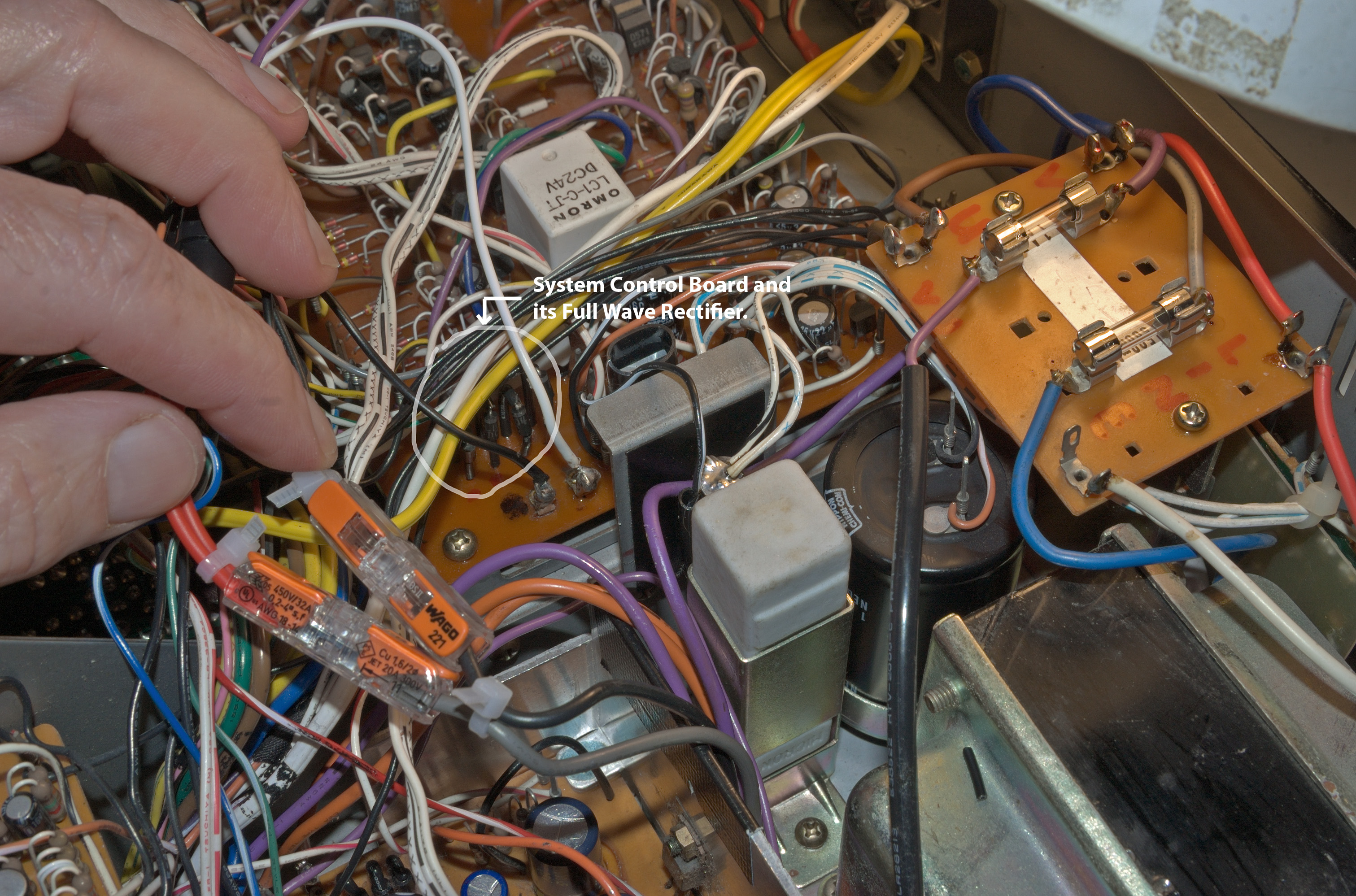 The diagram above shows new 1N4004 (400v reverse breakdown rated) equivalent diodes populating the full wave rectifier on the System Control board.
